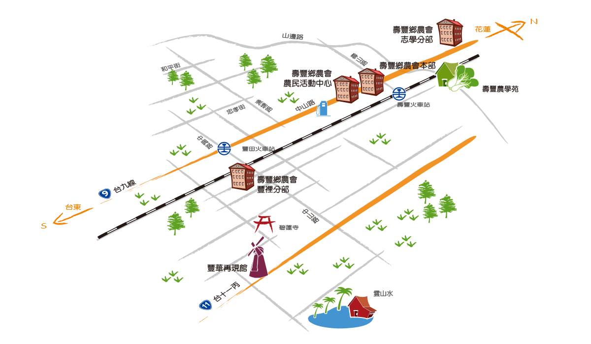 此外,農會附近還有日治時期所建立之三大移民村之一,由豐坪、豐裡及豐山等三個村落所組成的豐田社區,區內日本移民文化之遺跡保存完整,諸如日本豐田神社、哭牆、豐田鳥居(現稱碧蓮寺)移民指導所、日本醫生與警察的家,以及當年警察廳改置的豐田文史館與台灣少見的「廣島式」菸樓等,每一棟建築、每一個場景,都代表著一個感人的故事,相當值得您深入探索。